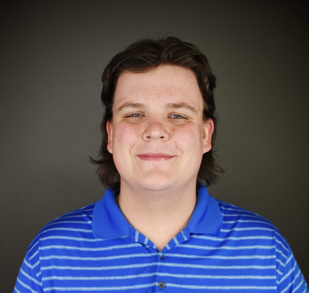 A young man with short dark hair, wearing a light blue sweater and a thin chain necklace, smiles at the camera against a blue-green background.