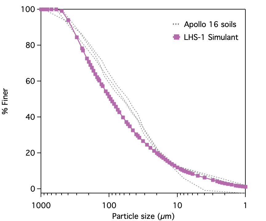 The particle size distribution of the simulant is targeted to match that of typical Apollo soils. LHS-1 does not currently simulate agglutinates or nanophase iron. However, our agglutinated simulant, LHS-1-25A, does simulate agglutinates characteristic of an intermediately mature Lunar Highlands Regolith. Custom simulated agglutinate mixes are also available upon request.