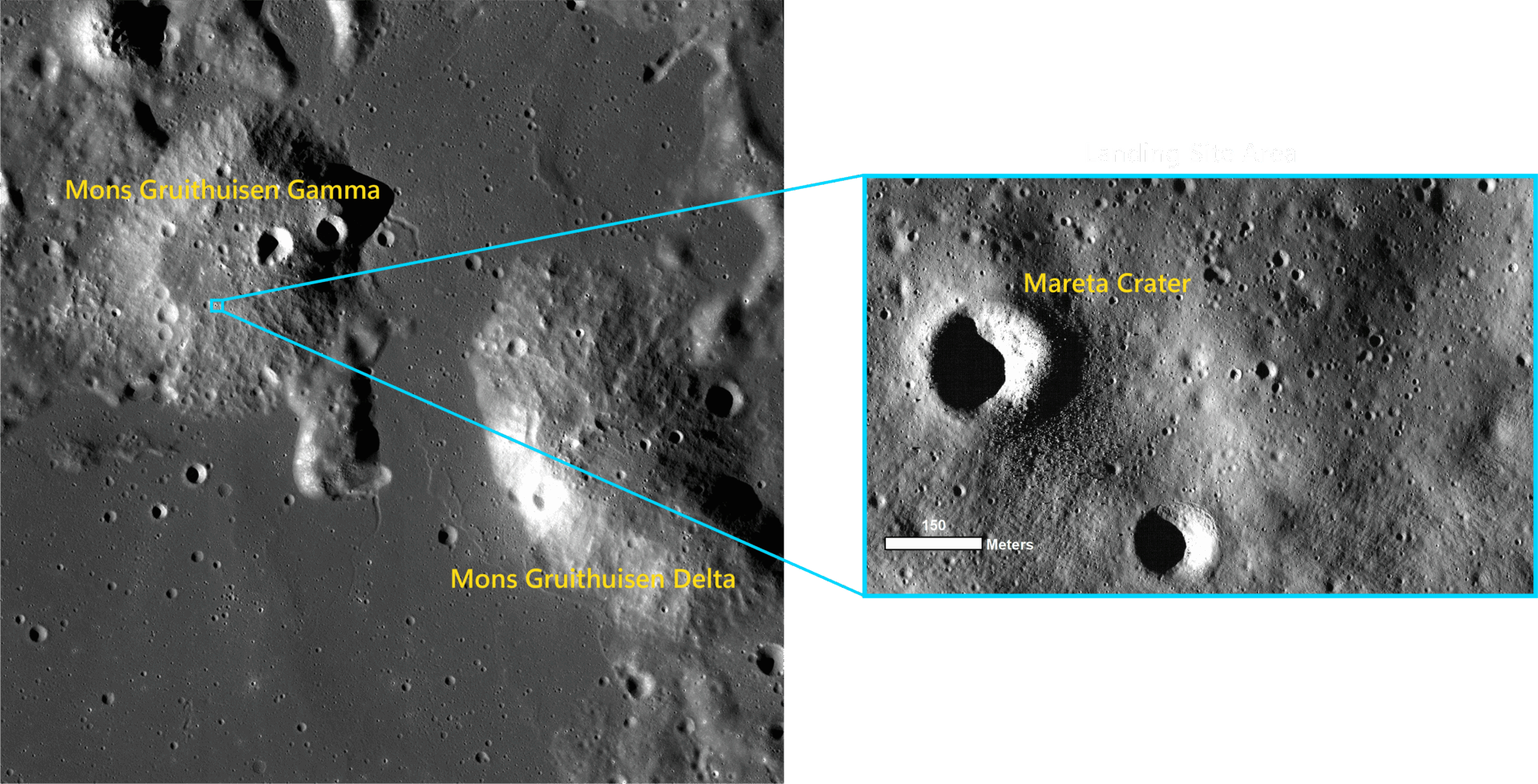 The landing site is far enough from Mareta crater to avoid the risk of accidentally landing inside but close enough to be able to take measurements of the rocks that were ejected from the crater at the time of impact.