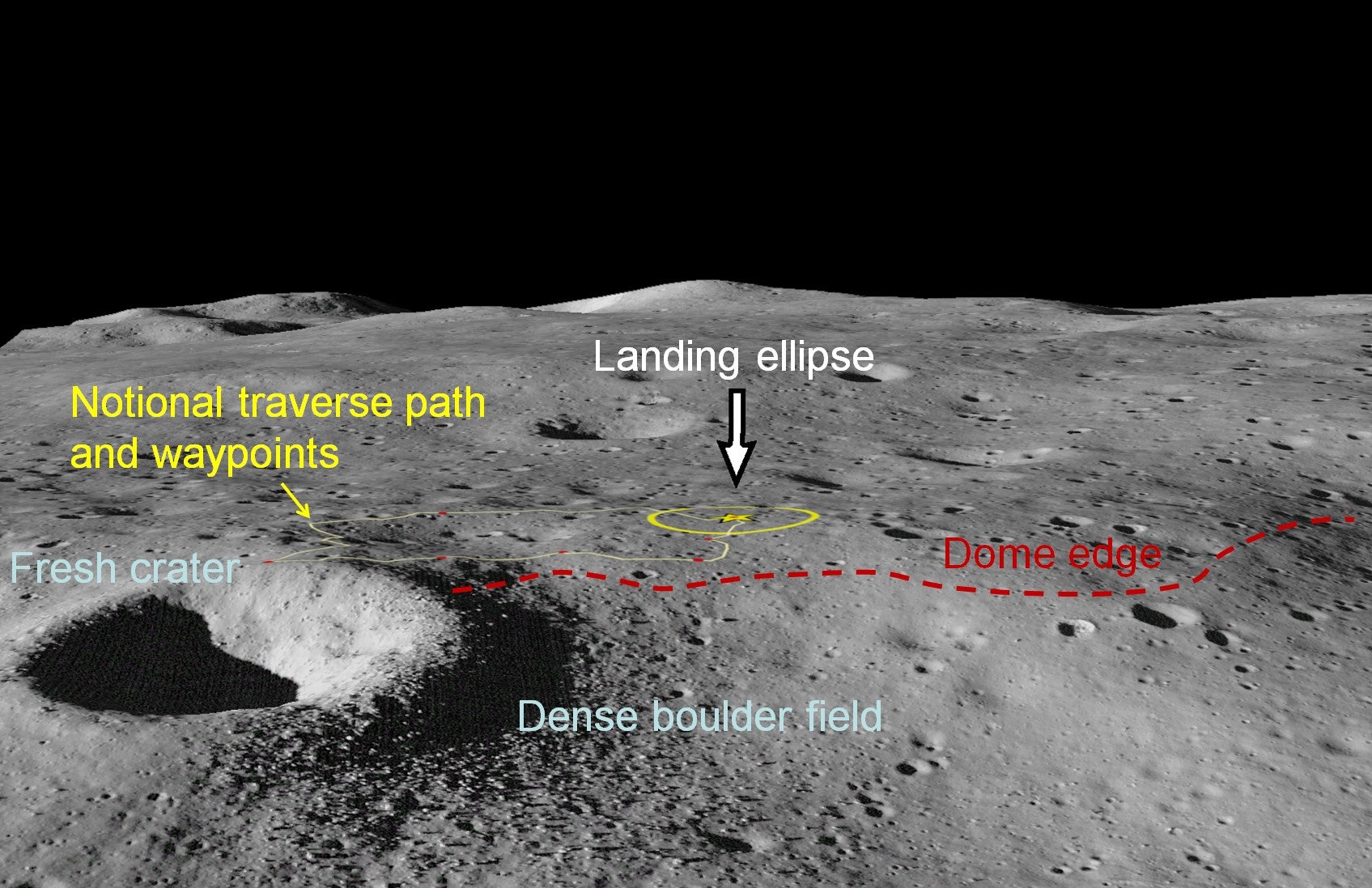 The landing site is far enough from Mareta crater to avoid the risk of accidentally landing inside but close enough to be able to take measurements of the rocks that were ejected from the crater at the time of impact.