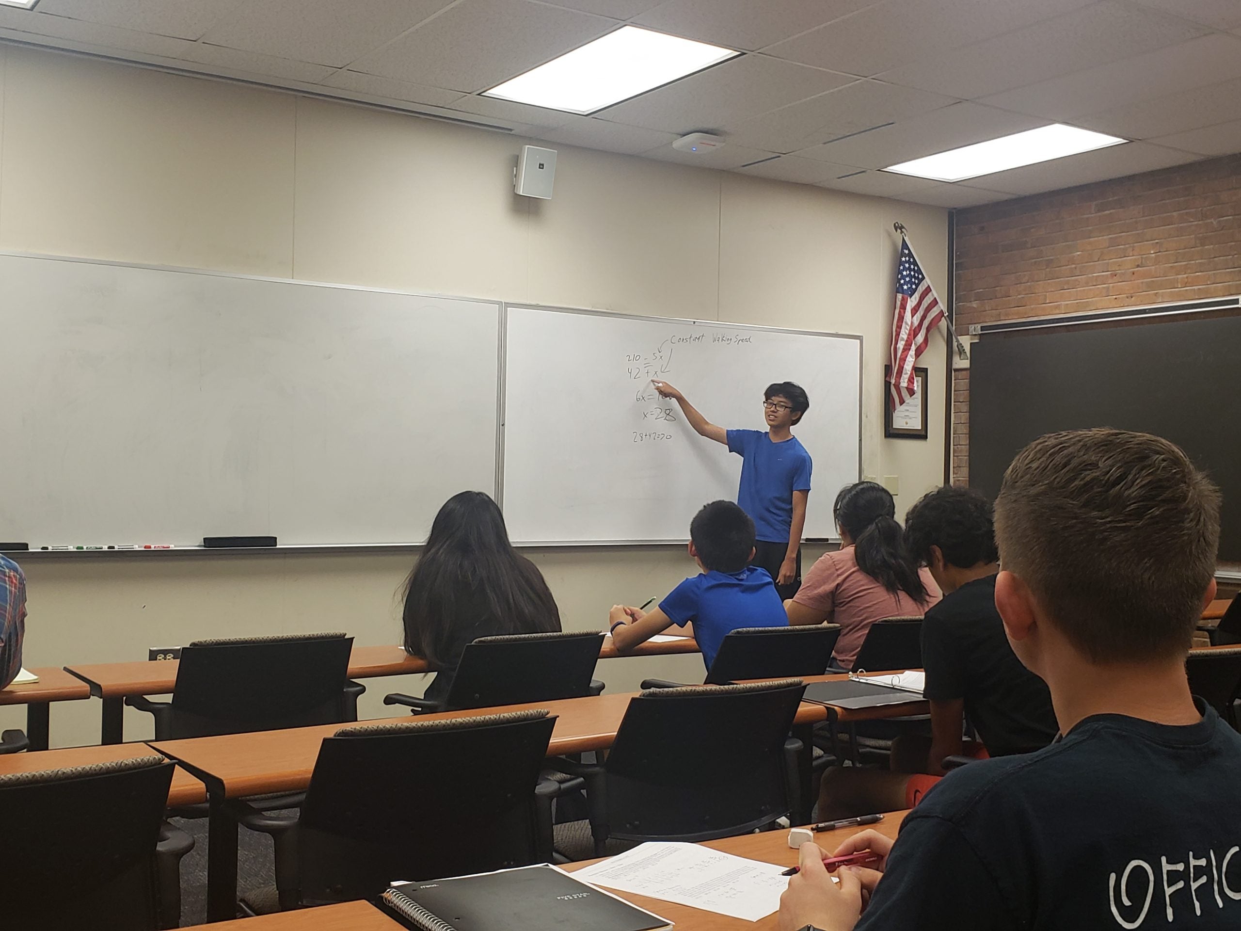A person in a blue shirt stands at the whiteboard, pointing to a math problem. Several students sit at desks, taking notes. An American flag hangs on the wall.