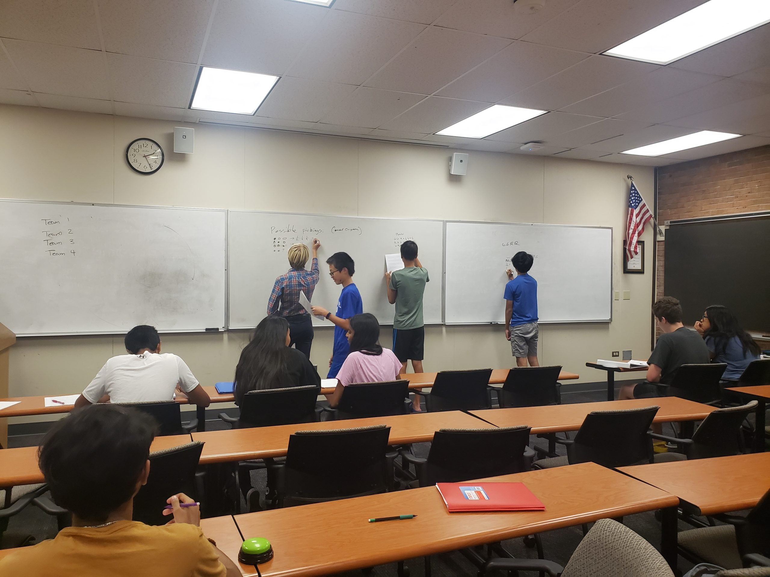 Students in a classroom work collaboratively on whiteboards at the front of the room while others remain seated, observing and taking notes. An American flag is displayed in the corner.