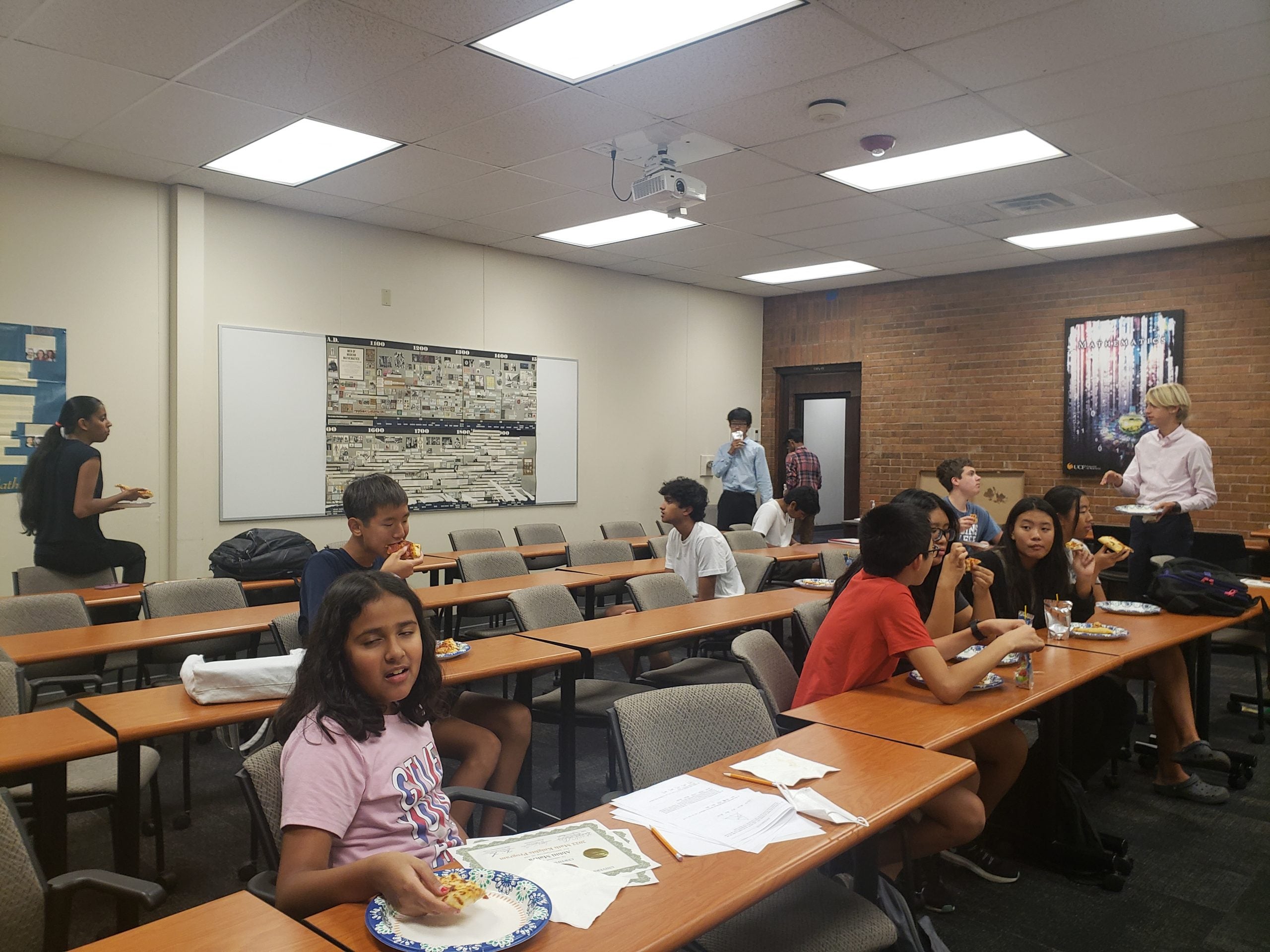 People are sitting and standing in a classroom. Some are eating, while others engage in conversation. The room has tables, chairs, a whiteboard, and wall decorations.