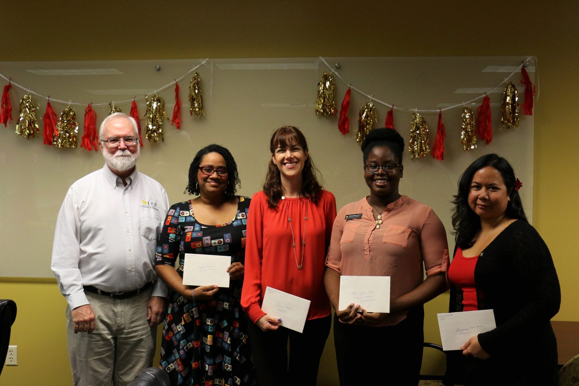 This year’s winners of the Dean’s Recognition Award are Esperanza Soto-Arcino (farthest to the right), graduate program assistant, and Jessica Brooks (third from left), senior accountant.