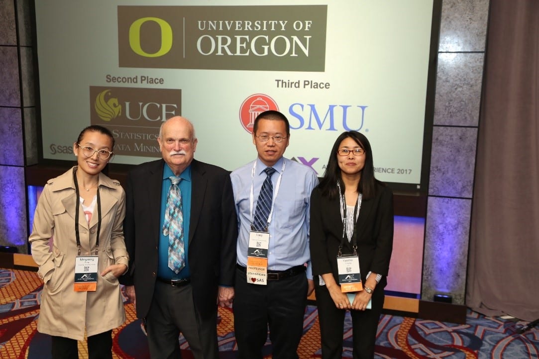 Historically, UCF teams have consistently placed in the top three spots in this competition, with top three finishes in 2011, 2012, 2016 and now 2017. The faculty advisors for previous years were Morgan Wang, Ph.D., and David Nickerson, Ph.D. This year’s team consisted of Yanmei Patella (team captain) and Mingming Zhou. Yanmei recently earned a master’s degree from UCF’s Data Mining Program. Mingming is currently completing a SAS Data Mining Certificate. Both were led by Li, who is a new member of the statistics faculty. This was his first competition, but he felt prepared thanks to the mentorship of Wang.
