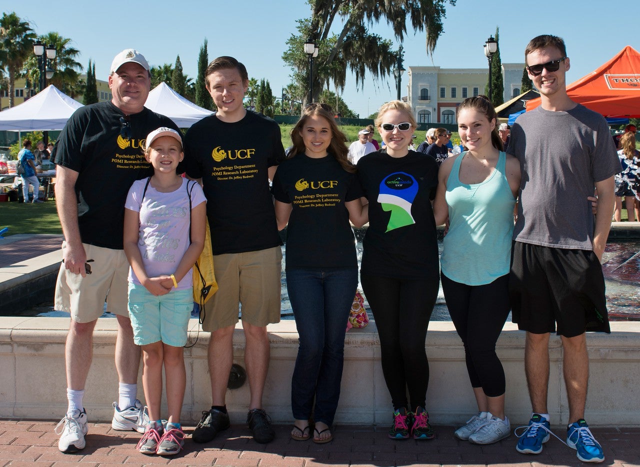 A group of seven people, some proudly wearing UCF shirts, gather outdoors in front of a fountain during a sunny day event in Orlando. They're united by their involvement in groundbreaking depression research.