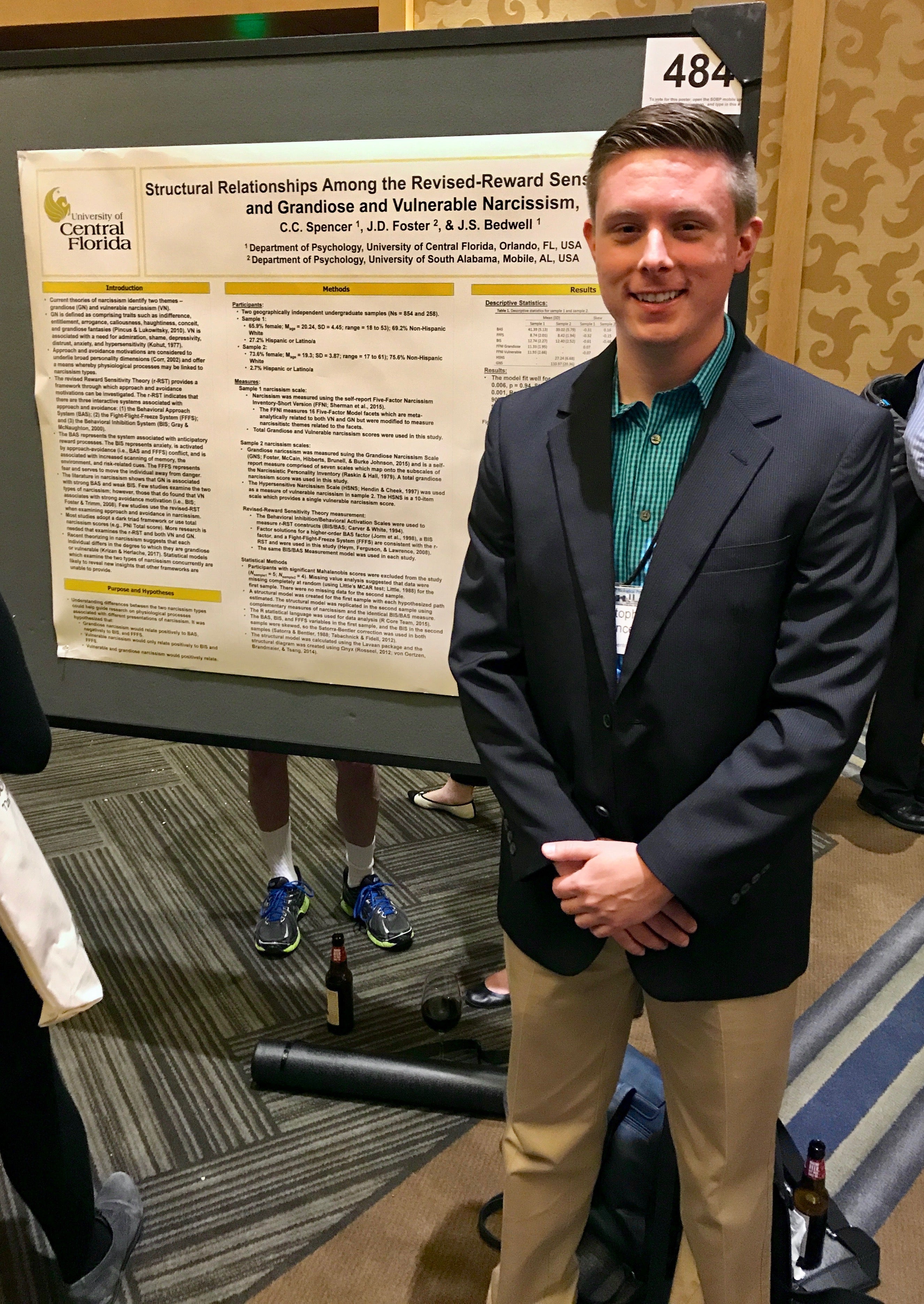 A man in a suit stands in front of an academic poster presentation on structural relationships in psychology, showcasing his depression research at a conference in Orlando, hosted by UCF.