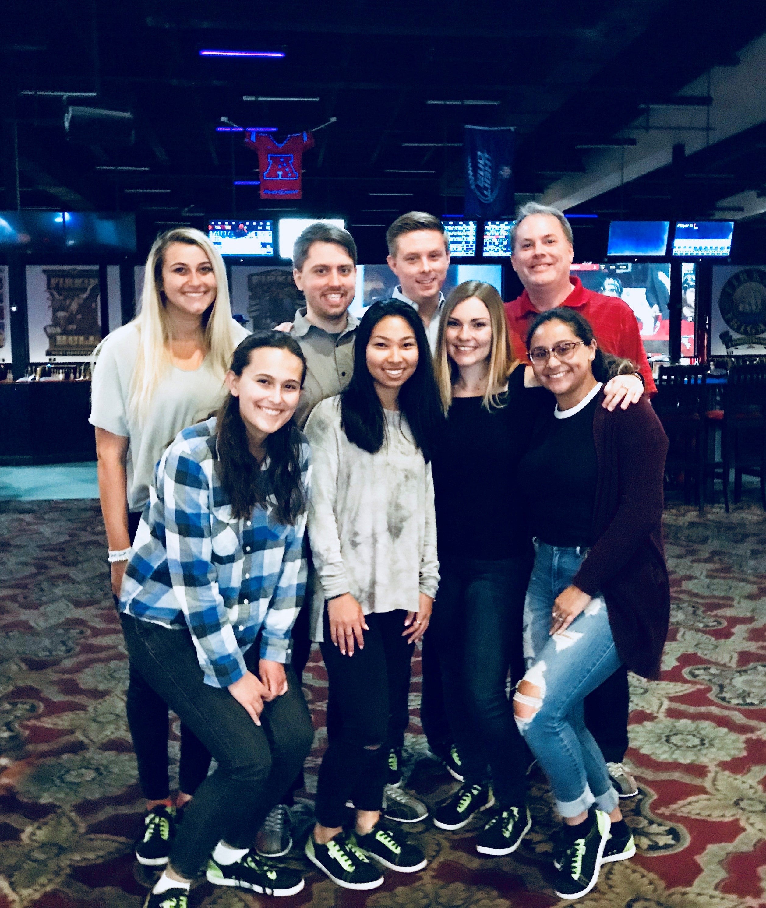 A group of eight people standing together indoors at UCF in Orlando, some wearing casual clothes, smiling at the camera, united by their work in depression research.